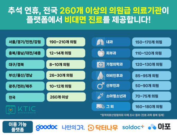 원격의료산업협의회(원산협)는 추석 연휴 기간 동안 회원사 비대면진료 플랫폼을 통해 전국 260개 이상의 의원급 의료기관이 비대면진료 서비스를 제공한다고 2일 밝혔다.
