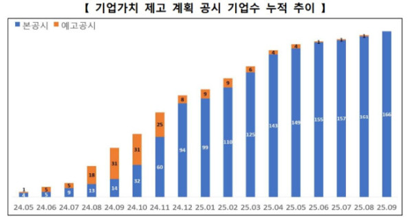 지난해 5월 기업가치 제고 계획 공시 시행 이후 지난달까지 166개 기업이 관련 공시를 제출했다. 코스피 상장사 중 128곳이, 코스닥 상장사 중 38곳이 제출했다. 지난달 △한국타이어테크놀로지 △풀무원 △유니테크노 △서울보증보험 △에스티팜이 신규 공시했다. 공시기업의 시가총액 비중은 전체 시장의 43.6%이며, 코스피 공시기업의 경우 코스피 시가총액의 49.6%를 차지한다.