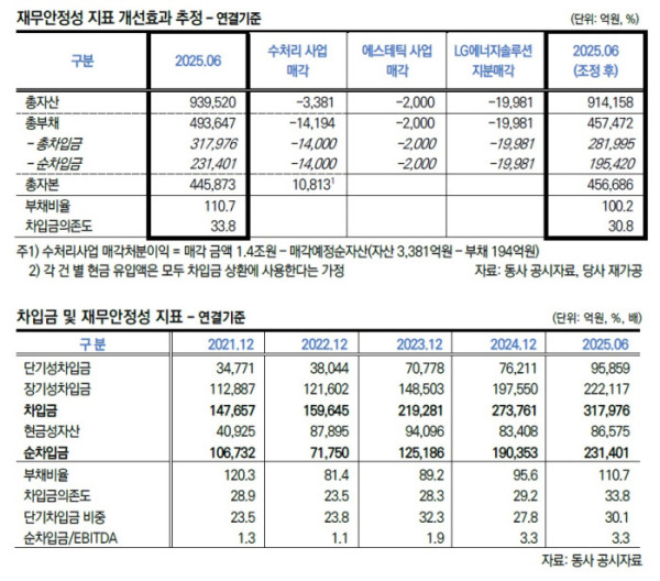 특히, 전지 부문 대규모 투자에 따른 차입 부담이 커지는 상황에서 이번 자산 매각이 단기적으로 재무 안정성 개선에 기여할 것으로 봤다. 한신평은 “연결 기준 부채비율은 110.7%에서 100.2%로, 차입금의존도는 33.8%에서 30.8%로 개선될 것”이라고 예상했다.