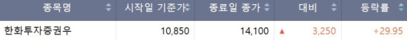 한화투자증권우는 전 거래일 대비 29.95% 오른 1만4100원에 마감했다. 한화투자증권이 지분투자한 두나무가 네이버의 자회사인 네이버파이낸셜 자회사로 편입될 것이라는 보도가 나온 이후 관심이 몰리는 것으로 풀이된다.