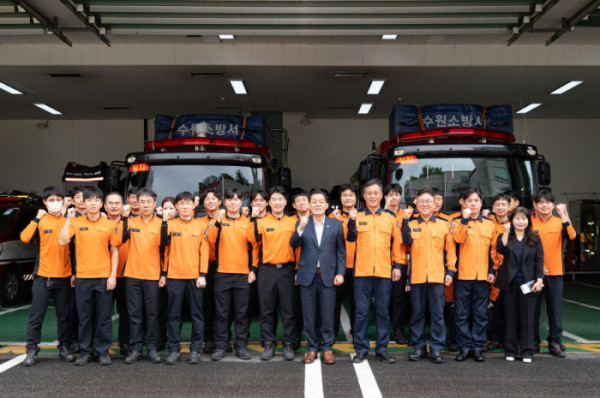 ▲이재준 수원시장(가운데)가 수원소방서 근무자들을 격려한 후 함께하고 있다. (수원특례시)