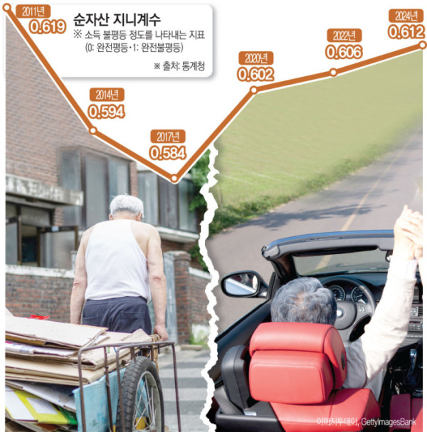 12일 통계청에 따르면 한국 사회 자산 불평등은 해가 갈수록 커지고 있다. 이를 보여주는 수치가 순자산 지니계수다. 총자산에서 부채를 뺀 순자산 기준으로 부의 분배 불평등을 나타내는 지표다. 순자산 지니계수가 0에 가까울 수록 부의 분배가 균등하고, 1에 가까울수록 불평등이 심하다는 뜻이다. 한국의 순자산 지니계수는 2011년 0.619에서 2017년 0.584로 하락세를 보였다. 하지만 2018년부터는 줄곧 오르더니 2024년 0.612까지 치솟았다. 자산 격차 심화는 일에 대한 동기 부여를 낮추고 미래에 대한 비관적 전망을 강화하는 결과로 이어진다.