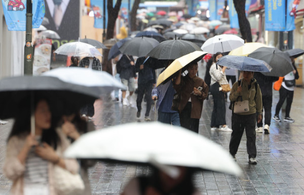 ▲9월 28일 비가 내리는 서울 중구 명동거리에서 시민 및 외국인관광객들이 우산을 쓴 채 걸어가고 있다. (연합뉴스)