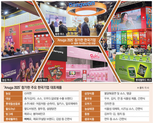 세계시장 제패를 꿈꾸는 국내 식품사들이 4일부터 8일(현지시간)까지 세계 최대 B2B(기업 간 거래) 식품 박람회 ‘아누가(Anuga) 2025’에서 제대로 맞붙었다. 올해 아누가에 첫 참가한 농심과 오뚜기, 롯데웰푸드, 삼양식품 등은 라면과 떡볶이, 핫도그, 김밥 등 세계인들이 무난하게 즐길 수 있는 K푸드를 경쟁적으로 앞세웠다