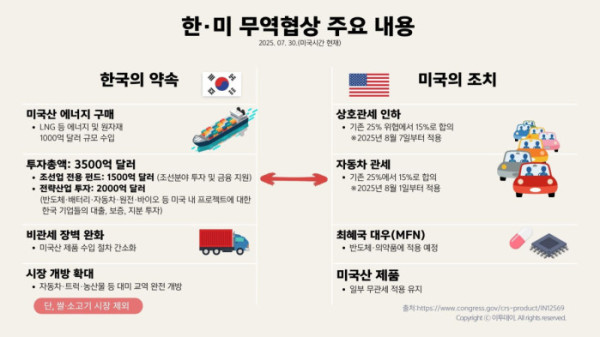 이에 미국은 자동차·상호관세를 25%에서 15%로 인하하고, 한국의 주력 수출 분야에 대한 최혜국 대우(MFN)를 약속하는 한편, 일부 미국산 제품에는 기존의 무관세를 유지하기로 결정했습니다.
