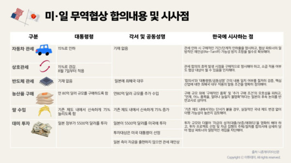 미국과 일본의 2025년 무역합의 핵심 내용을 주제별로 정리하고, 각 조항이 한국에 주는 시사점을 집중 분석해 보았습니다.