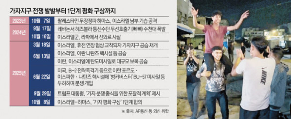가자지구 전쟁은 2023년 10월 7일 하마스가 이스라엘을 기습 공격하면서 1200명을 살해하고 251명을 인질로 끌고 가면서 시작됐다. 하마스가 억류 중인 인질은 현재 48명(생존자 20명)인 것으로 알려졌다. 2년간 하마스가 통치하는 팔레스타인 가자지구에서만 6만7000명 이상이 숨졌고 이스라엘에서도 약 2000명이 사망했다. 가자지구 대부분은 황폐해졌다.
