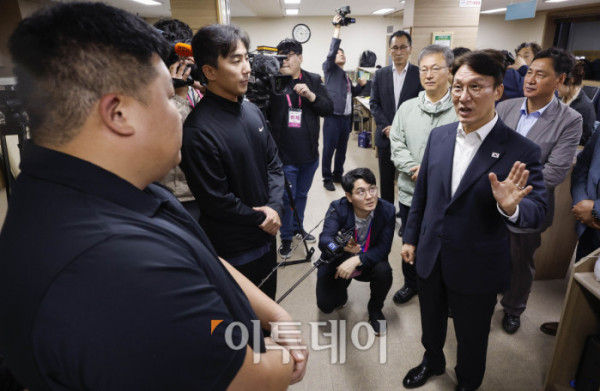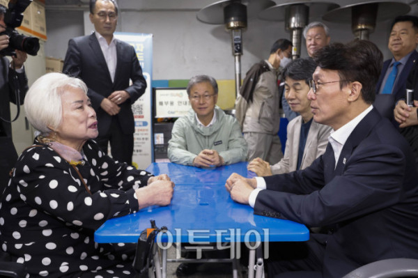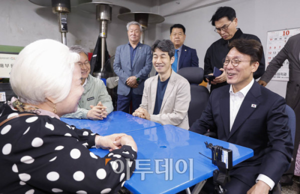 ▲김민석 국무총리가 10일 서울 구로구 남구로역 인근 인력사무소를 방문해 직원들을 격려하고 있다. 조현호 기자 hyunho@