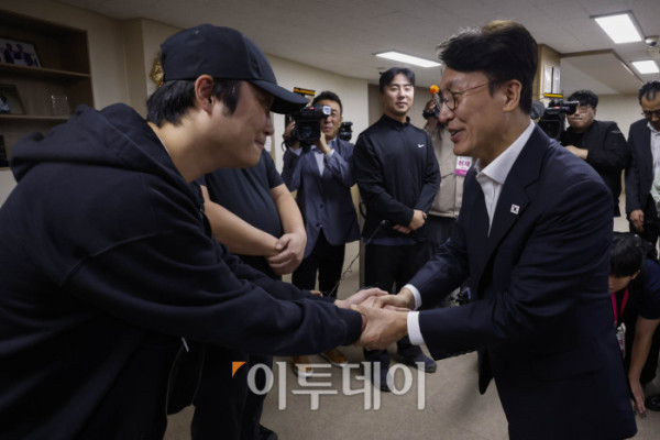 ▲김민석(오른쪽) 국무총리가 10일 서울 구로구 남구로역 인근 인력사무소를 방문해 직원들을 격려하고 있다. 조현호 기자 hyunho@