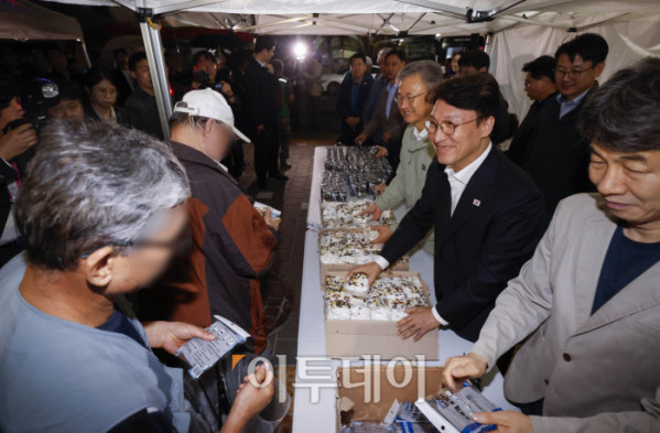 ▲김민석(오른쪽 두 번째) 국무총리가 10일 서울 구로구 남구로역 인근 인력시장을 방문해 건설 일용근로자들에게 간식과 팔토시 등 격려물품을 전달하고 있다. 조현호 기자 hyunho@