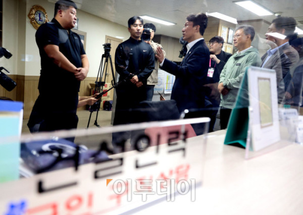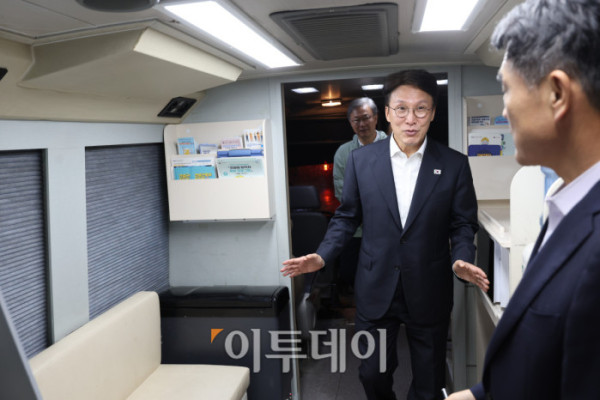 ▲김민석 국무총리가 10일 오전 서울 구로구 남구로역 인력시장 종합지원 이동 상담버스를 방문해 새벽시장 인력현황 등을 보고 받고 있다. 조현호 기자 hyunho@