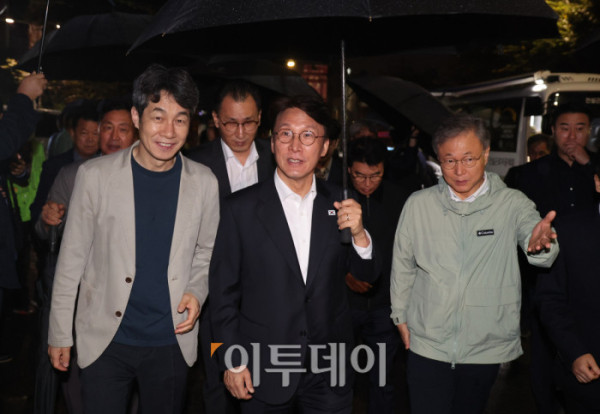 ▲김민석(가운데) 국무총리가 10일 서울 구로구 남구로역 인근 인력시장 종합지원 이동 상담버스에서 새벽시장 인력현황을 보고 받은 후 버스에서 내려 이동하고 있다. 조현호 기자 hyunho@