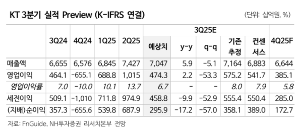 KT의 3분기 실적은 다소 부진할 것으로 예상된다. NH투자증권은 매출액 7조 원(전년 대비 +5.9%, 전분기 대비 -5.1%), 영업이익 4743억 원(전년 대비 +2.2%, 전분기 대비 -53.3%)으로 시장 컨센서스(5417억 원)를 밑돌 것으로 내다봤다.