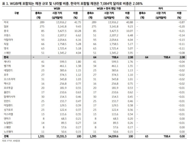 보고서는 패시브 자금뿐 아니라 액티브 자금의 선제 유입 가능성도 지적했다. 최근 금리 수준이 상승하며 메리트가 부각된 데다, WGBI 외에도 블룸버그 글로벌 종합채권지수, JP모건 이머징마켓(EM)지수 등 다른 벤치마크 지수에서 한국 국채 비중 확대가 가능하다는 것이다.