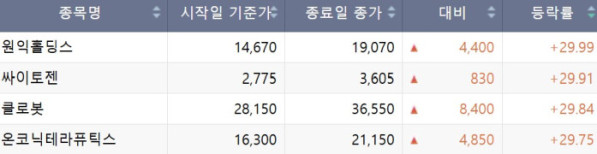 코스닥에서는 원익홀딩스, 싸이토젠, 클로봇, 온코닉테라퓨틱스 등 4종목이 가격제한폭까지 도달했다.