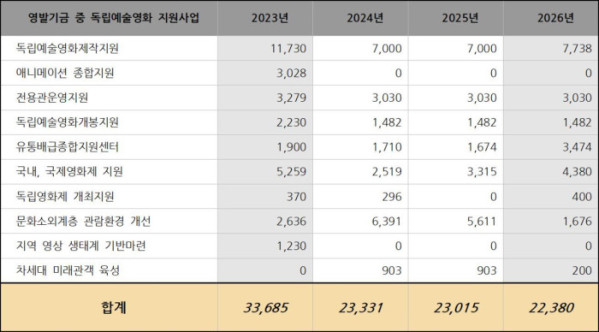 전체 영화 예산 규모가 확대된 상황에서 특정 분야만 삭감된 것은 정책의 일관성 측면에서도 문제라는 게 전문가의 지적이다. 정부가 K콘텐츠 육성과 산업 경쟁력 강화를 내세우고 있지만 그 토대가 되는 독립예술영화 지원을 축소해 산업 생태계의 뿌리를 스스로 약화시키는 조치라는 평가다.