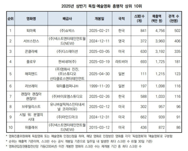 특히 올해 상반기 국내에서 개봉한 독립예술영화 중 흥행 10위권에 오른 한국 작품은 '퇴마록'과 '괜찮아 괜찮아 괜찮아!' 두 편뿐이다. 이 가운데 '퇴마록'이 애니메이션이라는 점을 감안하면, 실사영화로는 사실상 한 편만이 관객의 선택을 받았다.