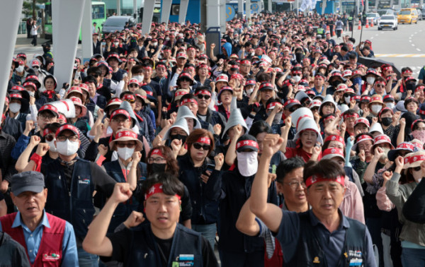 ▲2일 인천국제공항 제1여객터미널에서 열린 민주노총 공공운수노조 인천공항지역지부 전면파업 2일차 총파업 결의대회에서 참석자들이 구호를 외치고 있다.(연합뉴스)