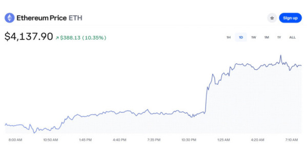 13일(한국시간) 오전 5시 50분 기준 미국 가상자산 거래소 코인베이스(Coinbase)에서 이더리움은 전일 대비 12.01% 오른 4199.97달러까지 치솟으며 하루 만에 450달러가량 상승했다. 이후 오전 7시 30분 현재는 4140달러 안팎에서 거래 중으로 상승 폭을 대부분 유지하고 있다.