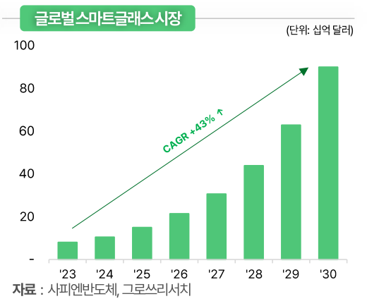 한용희 그로쓰리서치 연구원은 "최근 생성형 AI의 급속한 발전과 중요한 기술기업의 본격진입이 맞물리며 AI 스마트글래스 산업은 다시 성장궤도에 오르고 있다"라며 "올해 AR/VR 헤드셋과 스마트글래스의 출하량은 총 1430만 대로 전년 대비 39.2% 성장할 것으로 전망되며, 스마트글래스 시장은 2030년까지 연평균 47% 성장할 수 있다"라고 전했다.