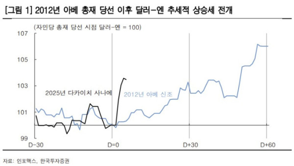 다카이치 총재의 정책이 아베노믹스와 방향은 같으나 강도는 다를 것으로 내다봤다. 2012년 아베 신조 전 총재 당선 당시에는 금융위기 이후 엔화의 고평가가 이어지던 가운데 일본은행(BOJ)의 양적·질적 완화(QQE) 도입이 겹치며 구조적 약세가 이어졌지만, 현재는 상황이 다르다는 분석이다.