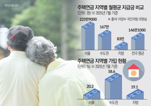 가입자의 월평균 지급금 격차도 크다. 전국에서 가장 많은 서울(225만9000원)을 포함한 경기(162만4000원), 인천(114만9000원) 등 수도권 평균은 약 167만 원이다. 전국 평균인 146만1000원을 웃돌았다. 반면 강원·충북·전남 등 8개 지역의 평균 지급액은 약 83만 원으로 서울의 3분의 1 수준이다. 지방의 경우 주택 가치가 낮고 담보평가액이 작아 연금 산정액이 줄어들 수밖에 없는 한계 때문으로 풀이된다.