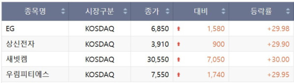 코스닥 시장은 EG(29.98%), 상신전자(29.90%), 새빗켐(30.00%), 우림피티에스(29.95%) 등 4개 종목이 상한가였다.