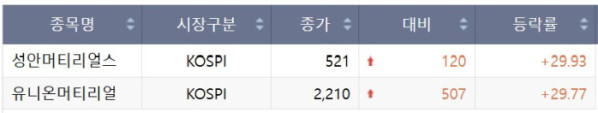 한국거래소에 따르면 13일 유가증권시장에서는 성안머티리얼스(29.93%)와 유니온머티리얼(29.77%)이 상한가를 기록했다.