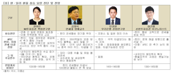 전문가들은 이달말로 예정된 APEC 정상회의가 향후 환율 방향을 가를 분수령으로 꼽았다. 하건형 이코노미스트는 “궁극적으로는 관세 협상 진전이 시장 심리를 결정할 것”이라며 “환율의 진정 시점은 외교 이벤트의 결말에 달려 있다”고 말했다. 이어 그는 “APEC 정상회의 전후로 한미 정상회담이 열릴 가능성이 있고, 협상이 진전될 경우 환율이 20~30원 하락할 수 있다. 반대로 합의 실패 시 일시적으로 1450원을 재시도할 가능성도 배제할 수 없다”고 했다. 민경원 우리은행 선임연구원도 “3500억달러 선투자 요구는 현실성이 낮아 협의가 장기화할 수밖에 없다. 하지만, 협상 지속 자체가 불확실성 완화의 신호가 될 수 있다”고 내다봤다.
