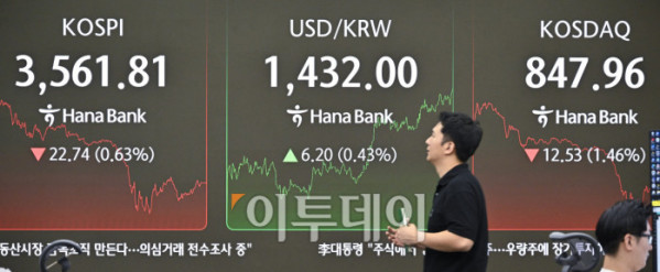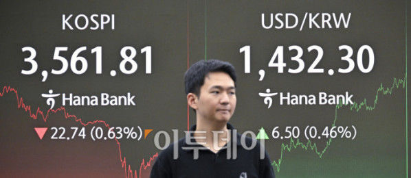 장중 3640선까지 치솟으며 사상 최고치를 경신한 코스피가 상승폭을 모두 반납하고 하락 전환하며 3560선으로 하락 마감했다. 14일 서울 중구 하나은행 딜링룸 전광판에 코스피, 코스닥, 원·달러 환율이 표시돼 있다. 이날 코스피 지수는 전 거래일보다 22.74(0.63%) 포인트 하락한 3561.81을 코스닥 지수는 12.53(1.46%) 포인트 하락한 847.96을 나타냈다. 이날 원·달러 환율은 종가 기준 1432.70원을 나타냈다. 조현호 기자 hyunho@