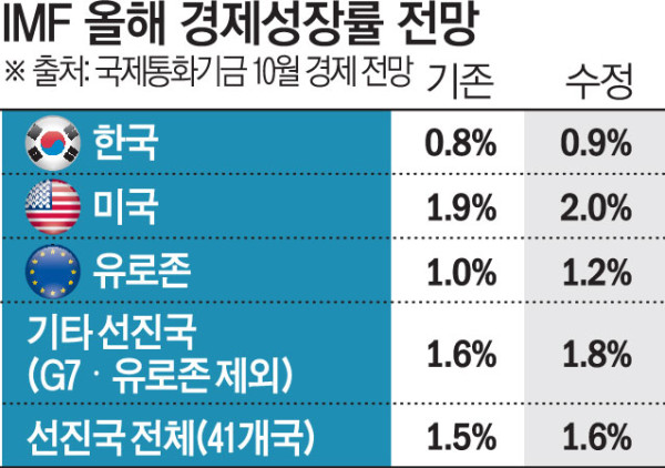 이는 IMF가 지난 9월 '2025년 한국 연례협의 보고서'에서 제시한 올해 성장률 전망치와 같은 수준이다. 당시 연례협의를 위해 방한한 IMF 미션단은 올해 한국 성장률 전망치를 0.8%에서 0.9%로 0.1%포인트(p) 높였다. 라훌 아난드 한국미션단장은 발표문에서 "완화된 재정·통화 정책에 힘입어 국내 수요가 점진적으로 회복되고 견조한 대외 반도체 수요가 다른 수출의 감소를 상쇄하면서 올해 성장률은 0.9%를 기록할 것"이라고 밝혔다.