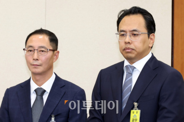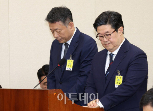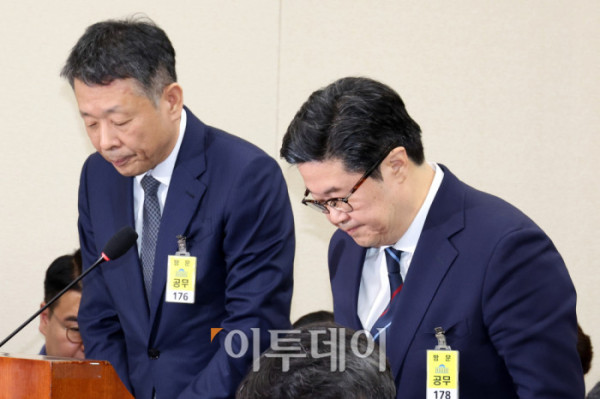▲김병주(오른쪽) MBK파트너스 회장과 김광일 홈플러스 대표가 14일 서울 여의도 국회에서 열린 정무위원회 국정감사에서 증인으로 출석해 인사하고 있다. 고이란 기자 photoeran@