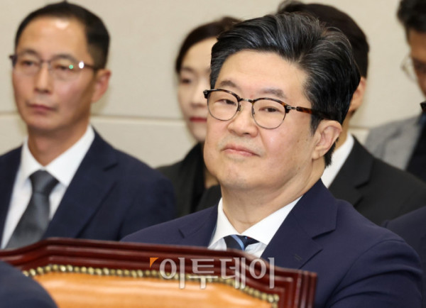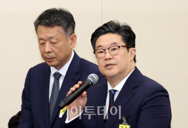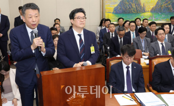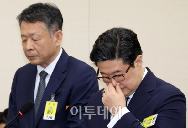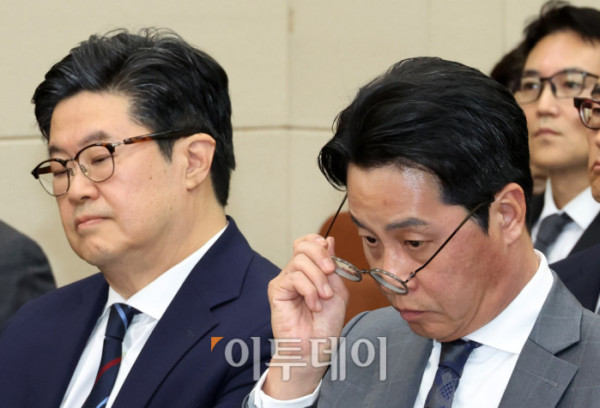 ▲김광일(왼쪽) 홈플러스 대표와 김병주 MBK파트너스 회장이 14일 서울 여의도 국회 정무위원회 국정감사에서 증인으로 출석해 의원 질의에 답하고 있다. 고이란 기자 photoeran@