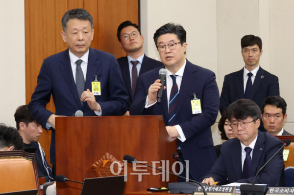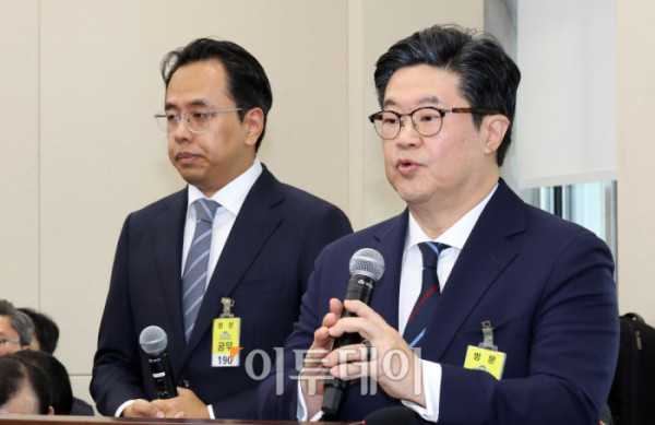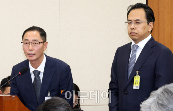 ▲김병주(오른쪽) MBK파트너스 회장과 김광일 홈플러스 대표가 14일 서울 여의도 국회 정무위원회 국정감사에서 증인으로 출석해 의원 질의에 답하고 있다. 고이란 기자 photoeran@