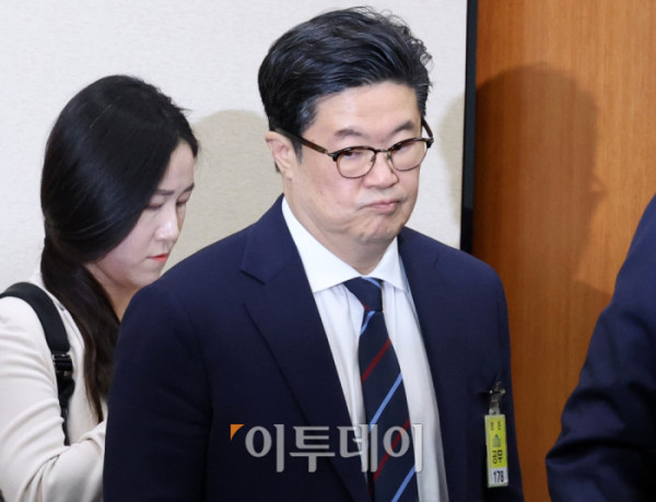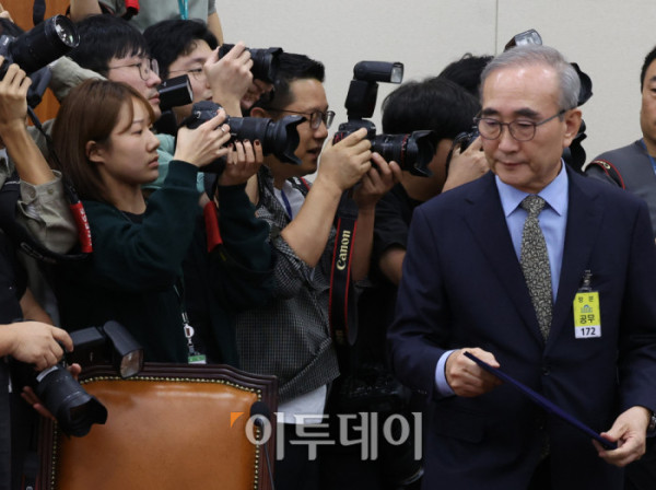 ▲김영섭 KT 대표가 14일 서울 여의도 국회에서 열린 정무위원회 국정감사에서 증인선서를 마치고 윤한홍 위원장에게 선언문을 전달하기 위해 이동하고 있다. 고이란 기자 photoeran@