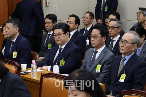 ▲김영섭(앞줄 오른쪽부터) KT 대표, 조좌진 롯데카드 대표, 김병주 MBK파트너스 회장, 김광일 홈플러스 대표가 14일 서울 여의도 국회에서 열린 정무위원회 국정감사에서 증인으로 출석하고 있다. 고이란 기자 photoeran@