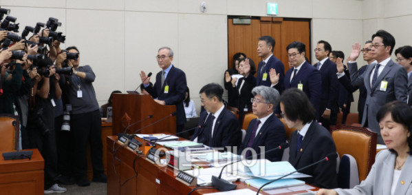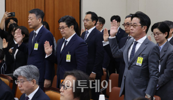 ▲김영섭 KT 대표가 14일 서울 여의도 국회에서 열린 정무위원회 국정감사에서 김광일 홈플러스 대표, 김병주 MBK파트너스 회장, 김범석 우아한형제들 대표, 김명규 쿠팡이츠 대표, 조좌진 롯데카드 대표 등 참석자들과 증인선서를 하고 있다. 고이란 기자 photoeran@