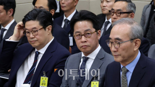 ▲김영섭(오른쪽부터) KT 대표, 조좌진 롯데카드 대표, 김병주 MBK파트너스 회장이 14일 서울 여의도 국회에서 열린 정무위원회 국정감사에서 증인으로 출석하고 있다. 고이란 기자 photoeran@