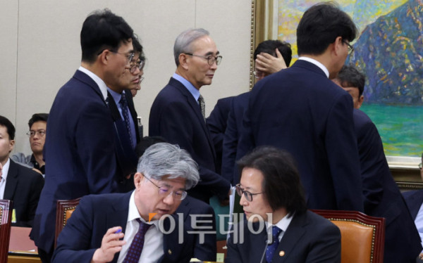▲김병주 MBK파트너스 회장이 14일 서울 여의도 국회 정무위원회 국정감사에서 증인으로 출석하고 있다. 고이란 기자 photoeran@