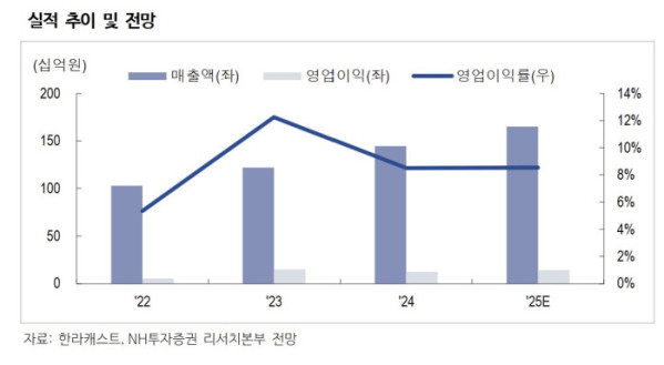 해당 업체로 인한 수주잔고는 1186억 원에 달할 전망이다. 강 연구원은 "휴머노이드 양산 스케줄과 맞물려 한라캐스트 관련 수주가 가파르게 증가할 전망"이라고 했다. 올해 매출액은 전년 대비 14.2% 증가한 1650억 원, 영업이익은 14.7% 늘어난 141억 원으로 관측됐다.
