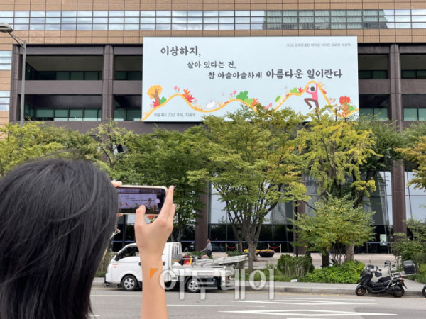 ▲15일 한 시민이 서울 광화문 교보문고 외벽의 글판을 촬영하고 있다. 글판의 내용은 최승자 시인의 ‘20년 후에, 지에게’에서 발췌한 문장이다. 박진희 수습기자 jinhee12@