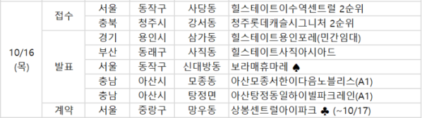 또 경기 용인시 '힐스테이트용인포레(민간임대)'와 부산 동래구 '힐스테이트사직아시아드', 서울 동작구 '보라매휴마레', 충남 아산시 '아산모종서한이다음노블리스(A1)', '아산탕정동일하이빌파크레인(A1)' 등은 이날 당첨자를 발표한다.