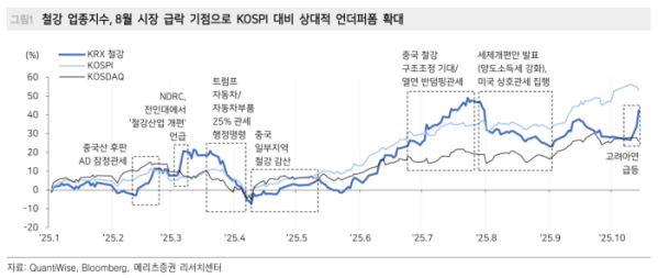메리츠증권에 따르면 2025년 국내 철강 업체들의 주가는 글로벌 무역 긴장, 중국의 감산정책, 그리고 한국 정부의 반덤핑 관세라는 세 가지 변수 속에서 변동성을 보였다. 연초 이후 코스피 대비 아웃퍼폼 기간은 주로 2~3월과 7월로 한정되었으며, 이 시기 주가 상승의 주요 동인은 한국 정부의 중국산 철강 제품에 대한 반덤핑 관세 부과와 중국 철강 산업의 구조조정에 대한 시장 기대감이었다.