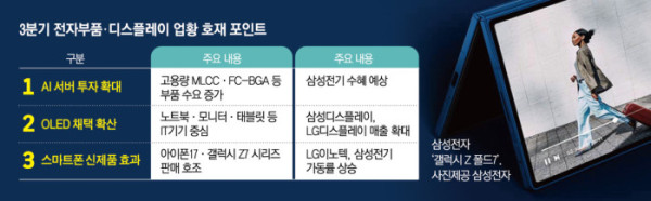 3분기 삼성전자의 신제품 갤럭시Z7 시리즈 판매 호조도 부품업계에 긍정적으로 작용한 것으로 분석된다. 카메라 모듈 등을 공급하는 삼성전기가 직접적인 수혜를 입은 것으로 보이며, 김선우 메리츠증권 연구원은 “MX(모바일경험) 사업부가 제품 차별화 전략을 강화하면서 판매 확대 효과가 뚜렷하게 나타났을 것”이라고 말했다.