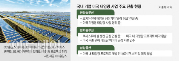 이 같은 흐름 속에서 국내 주요 태양광 기업들은 앞다퉈 미국 시장 공략에 나섰다. 한화솔루션은 미국 조지아주에 태양광 생산거점 ‘솔라 허브’를 건설 중이다. 텍사스주에 셀 생산 공장을 건설 중인 OCI홀딩스는 최근 베트남 웨이퍼 공장 ‘엘리트 솔라 파워 웨이퍼’의 지분 65%를 인수하며 미국에 태양광 웨이퍼를 수출하기 위한 기회를 마련했다. 이곳에서 '비 금지외국기관'(Non-PFE) 태양광용 웨이퍼를 생산하면 미국 수출이 유리하기 때문이다. 삼성물산 상사부문도 미국 내에서만 100여 건의 태양광 개발 건을 보유하고 있는 것으로 알려졌다. 이는 총 22~23GW에 달하는 규모다.