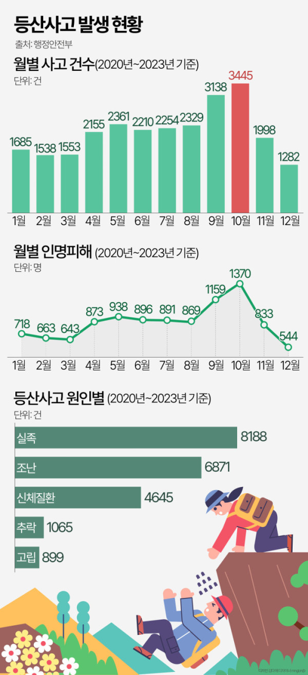 행정안전부 재난연감에 따르면 최근 3년간(2021년∼2023년) 등산 사고는 10월에 3445건으로 가장 많이 발생했다. 이어 9월 3138건, 5월 2361건, 8월 2329건 등이었다.