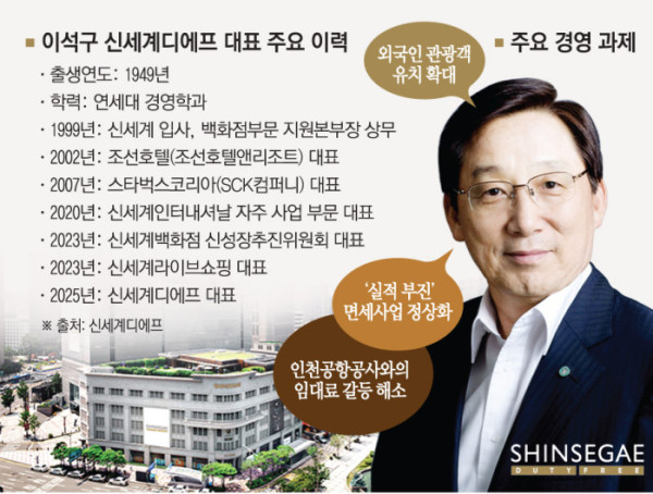 면세점으로 자리를 옮긴 이 대표가 가장 먼저 한 일은 영업본부 산하에 있던 인천공항 면세점을 대표(본점) 직속으로 변경한 것이다. 업체 관계자는 “중요도가 큰 점포에 대해서는 본인이 직접 챙기겠다는 차원”이라며 “아직은 초기 단계인 만큼 향후 구체적인 사업 방향을 구상하고 있다”고 밝혔다. 그가 지휘봉을 잡은 신세계디에프는 현재 업황 부진에 따른 구조적 어려움을 겪고 있다. 회사는 2023년 인천국제공항 제1터미널 면세점 운영 계약을 체결해 DF2(향수·화장품·주류·담배)와 DF4(패션·액세서리·부띠끄) 구역을 운영하고 있다.