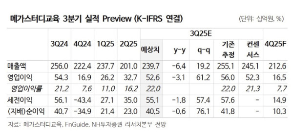 메가스터디교육의 3분기 매출액은 6% 감소한 2397억 원, 영업이익은 3% 줄어든 526억 원으로 전망됐다. 부문별로 보면 유초중등(-4%), 고등 (-4%), 성인(-15%) 등이다.