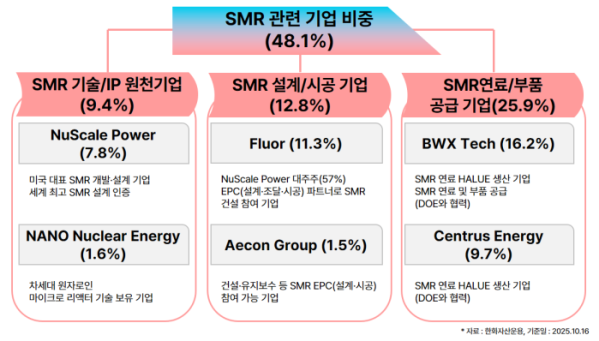 SMR 기술 IP 등 원천기술을 보유한 △뉴스케일파워(7.8%) △나노뉴클리어에너지(1.6%)를 비롯해 SMR을 건설하고 핵심 기자재를 납품하는△BWX테크(16.2%) △플루오르(11.3%) △에이콘그룹(1.5%), SMR 연료가 되는 고농축우라늄(HALEU)을 독점 공급하는 △센트러스에너지(9.7%) 등을 편입하고 있다.
