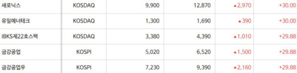 17일 한국거래소에 따르면 코스피에서 금강공업과 금강공업우 등 2개 종목이 상한가를 기록했다. 코스닥에서는 새로닉스와 유일에너테크, IBKS제22호스팩이 상한가를 기록했다.
